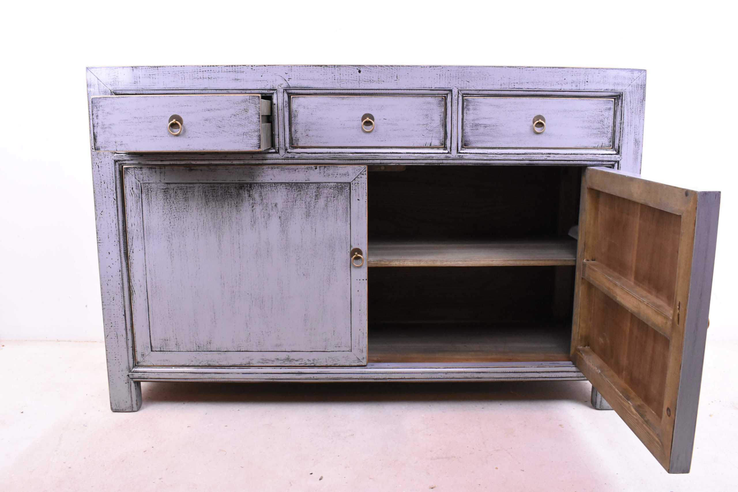 Mooi grijs chinees dressoir afgewerkt met hoogglans lak.